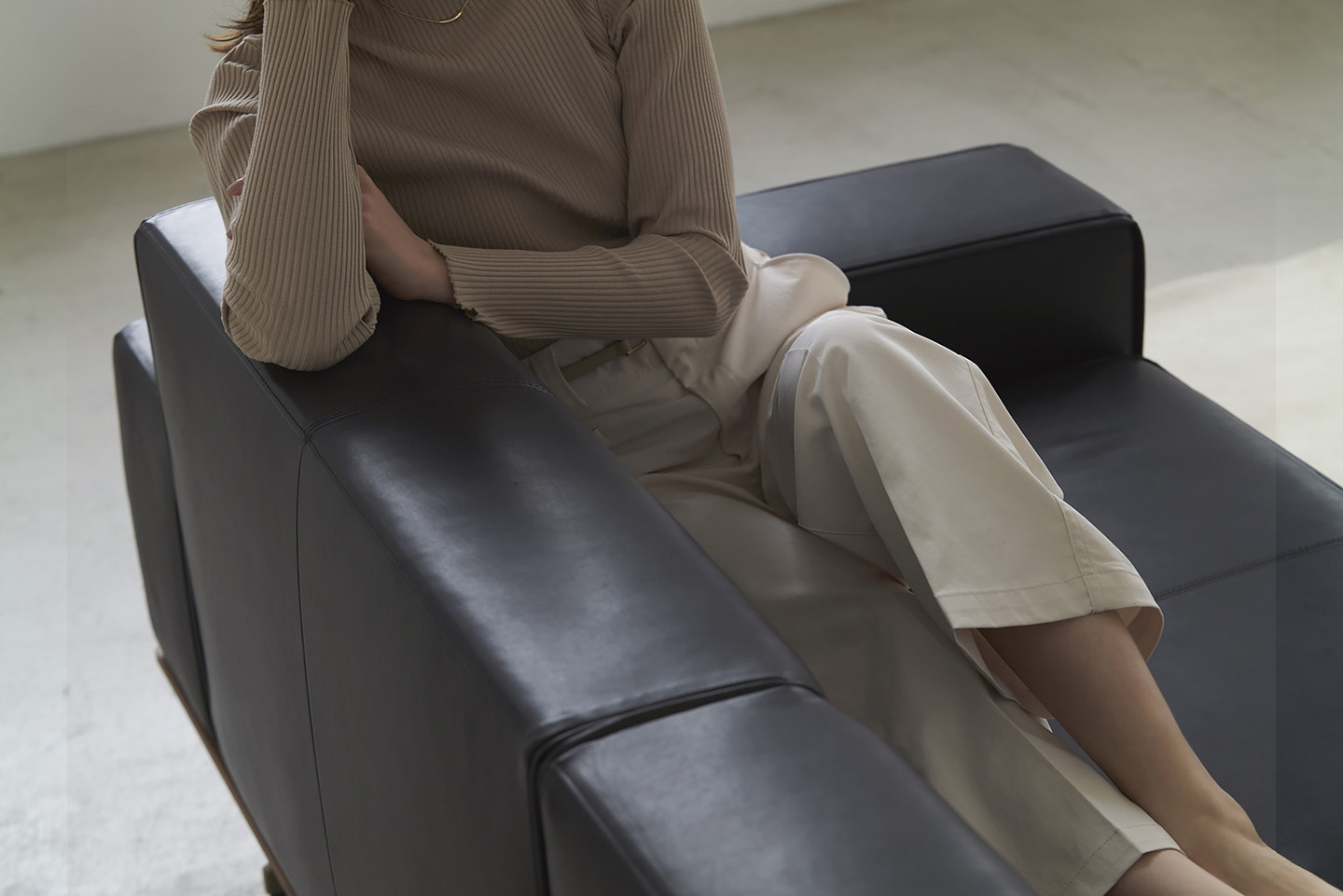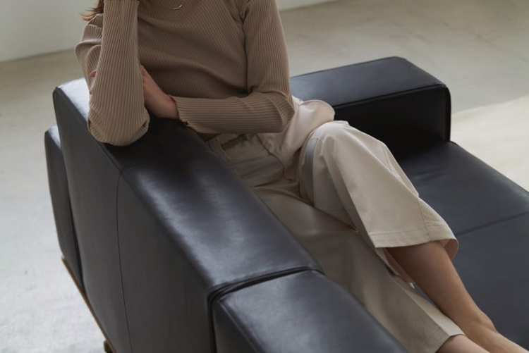 どっしりとした姿に似合わず、座った瞬間にしっとりと体を受け止める安らぎ。 やや深めの奥行きと角度をつけた座が、ゆるやかに力を解きほぐし、自然と身を預けたくなる座り心地。 縦に伸びるカウチは全身を受けとめ、ひと息ごとに静かな安堵が広がる。