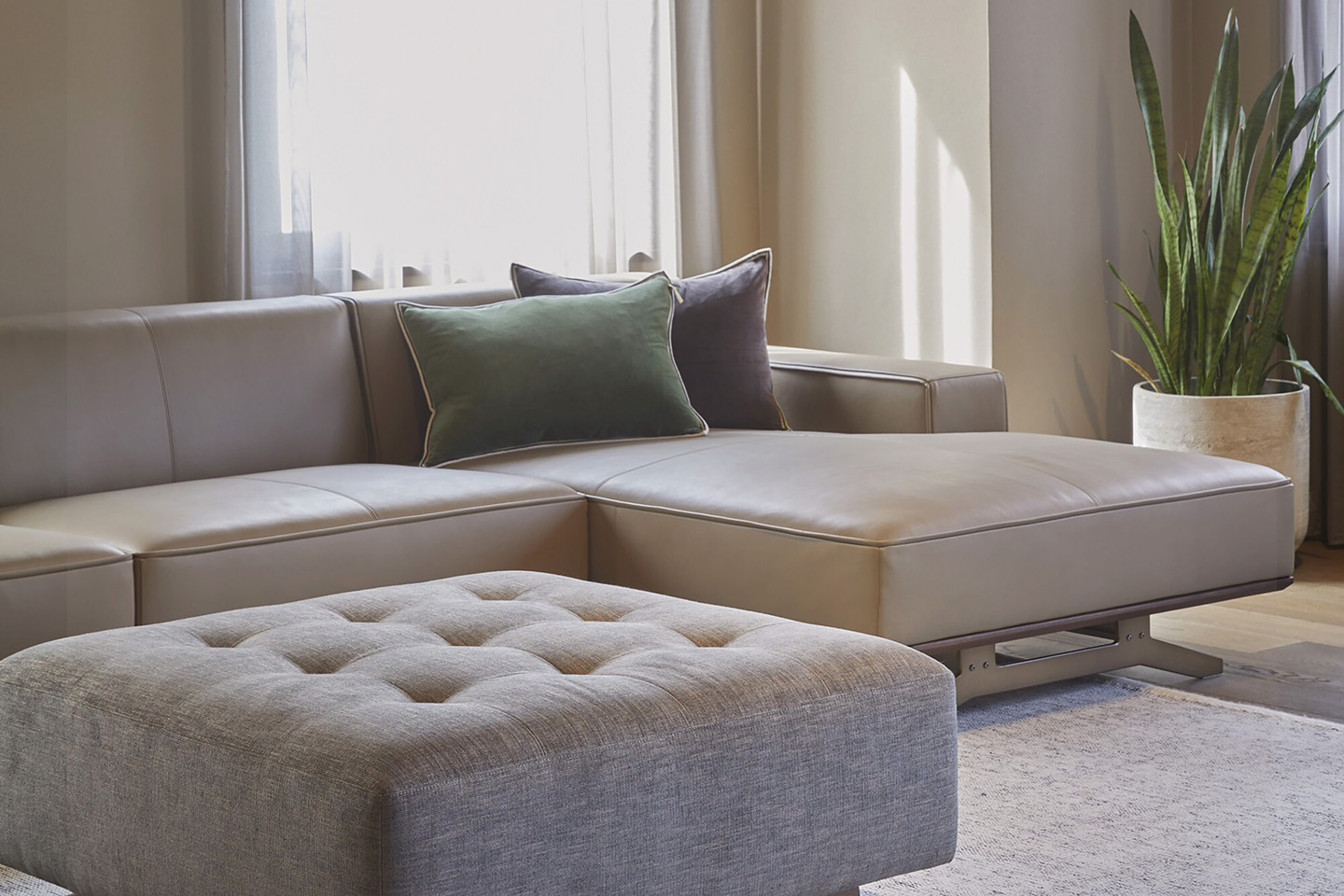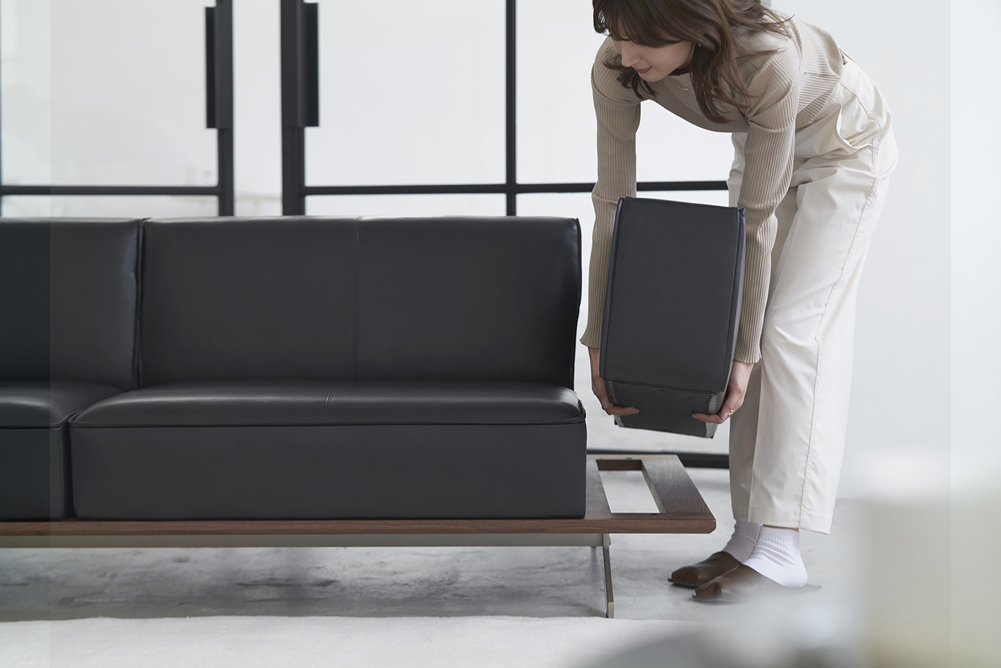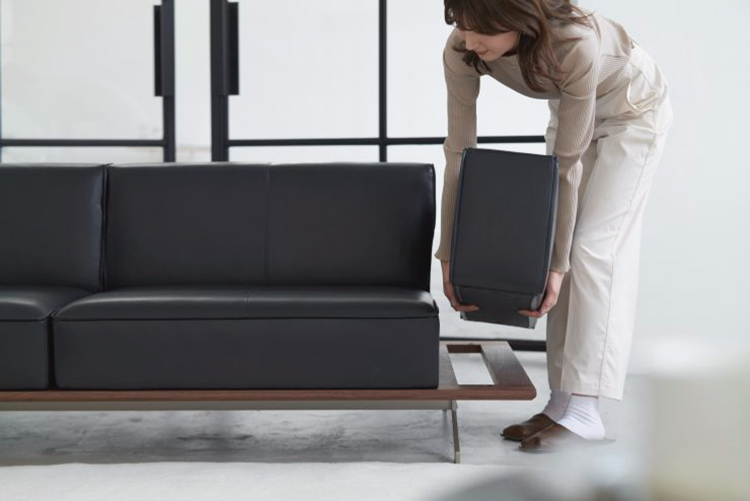 大きな存在感を保ちながら、どんな間取りにもスムーズに搬入できるノックダウン式を採用。 普段は脚を外すだけで軽やかに搬入でき、必要に応じて本体・台輪・肘・脚まで分解可能。 それでも、ノックダウン式であることを感じさせない丁寧な仕立てが、堂々とした佇まいを損なわない。床からそっと浮かせた脚元は、掃除や空間の見え方にも配慮した心地よい工夫が施されている。